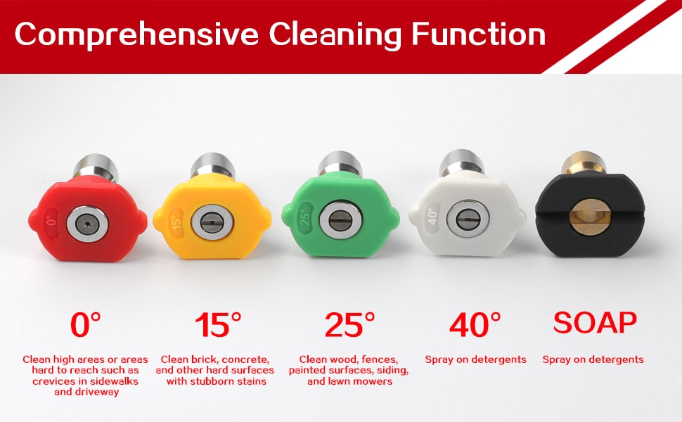 My nozzle collection was a bit thin after a recent move. Most got lost somewhere along the way and I was down to just the soap applicator. Found this collection which included all the ones I was missing along with a zero degree nozzle.